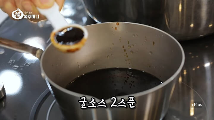 소스 냄비에 맛술 10스푼, 진간장 2스푼, 참치액젓 2스푼, 굴소스 2스푼, 설탕 1스푼, 물 200ml를 넣고 중불에서 끓입니다.