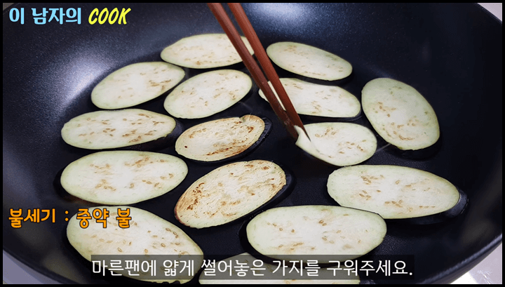 3) 지용성 비타민을 가지고 있는 가지를 기름에 구워주면 가장 좋지만, 물컹거리는 식감이 있을 수 있으니 기름을 두르지 않고 마른팬에서 구워줍니다.