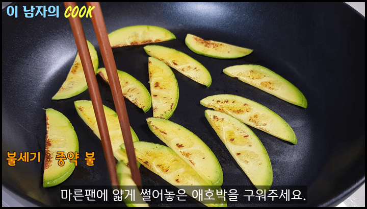 5) 애호박도 마찬가지 방법으로 마른팬에 구워줍니다.