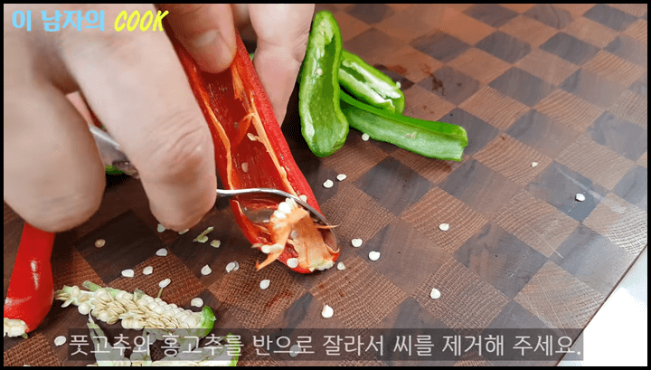 3) 풋고추 2개와 홍고추 1개를 반으로 갈라 씨를 제거한 다음 가늘게 채 썰어줍니다.