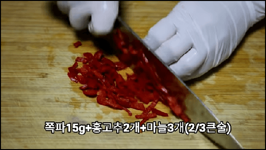 쪽파는 송송 썰어주고, 홍고추 2개도 잘게 썰고, 마늘 3개는 다져줍니다. 다져둔 마늘보다는 통마늘을 바로 다져서 사용하는 것이 더 맛있습니다.