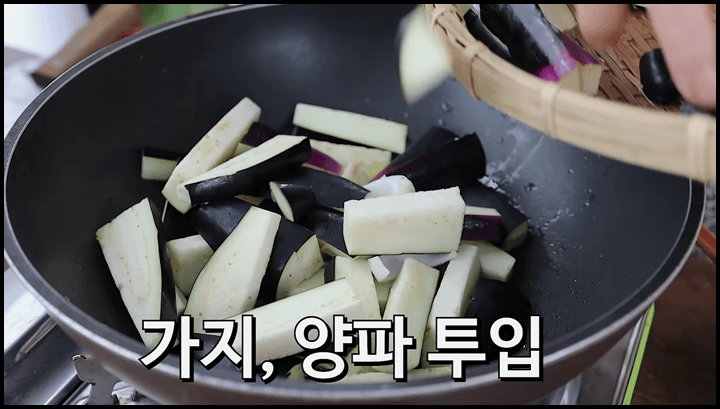 2) 가지와 양파를 먼저 넣고 살살 볶아줍니다.