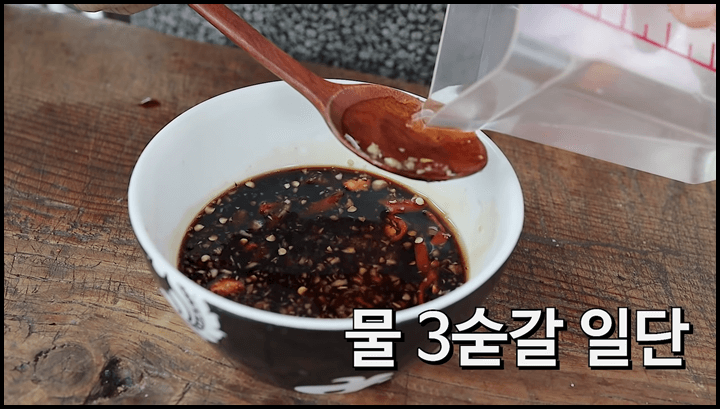 3) 물 3큰술을 넣어줍니다. 물은 나중에 볶다가 부족하면 더 넣어도 됩니다.