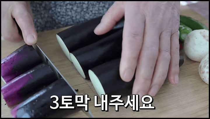1) 깨끗이 씻은 가지는 위아래 꼭지를 제거한 후 3등분으로 잘라줍니다.