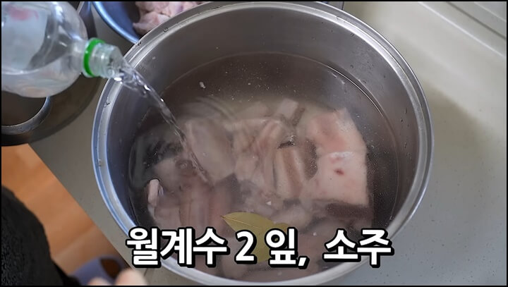 월계수잎 2장 정도 넣고, 소주도 적당량 넣어줍니다. 잡내 제거를 위해 소주는 꼭 넣어주는 것이 좋습니다.