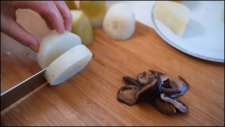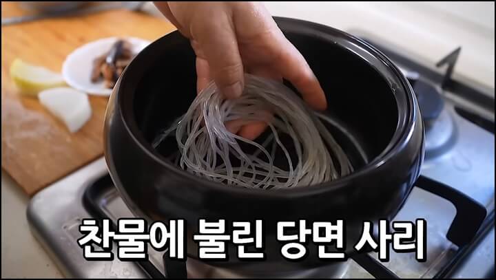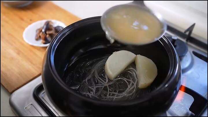 육수를 내고 건져냈던 표고버섯을 적당한 크기로 썰고, 무도 큼직하게 썰어줍니다. 뚝배기에 불린 당면 사리를 먼저 넣어주고, 무도 두 조각 정도 넣어 준 후 갈비탕 국물과 고기를 넣고 끓여줍니다.