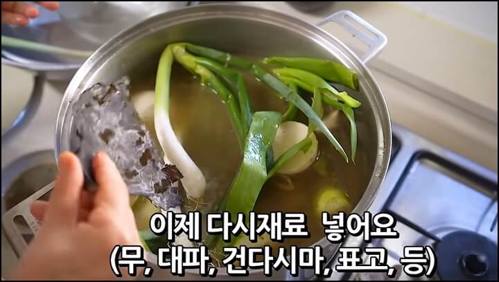 그리고 야채 재료들을 같이 넣어줍니다. 썰어두었던 무를 모두 넣고, 대파, 건다시마, 표고를 모두 넣어줍니다. 그리고 뚜껑을 닫아서 팔팔 끓여줍니다. 5분 정도 강불에서 끓인 후 불을 낮춰서 15분 정도 더 끓여줍니다.
