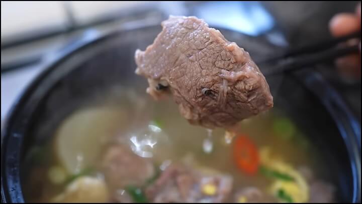 양파는 넣지 않는데 양파를 넣으면 노랑 내(?)가 나서 안 좋다고 합니다. 그리고 마늘도 넣지 않는데요, 마늘과 양파가 들어가면 소고기뭇국 같은 맛이 나고, 마늘과 양파를 넣지 않고 끓이면 정통 찐 고깃국 맛이 납니다.