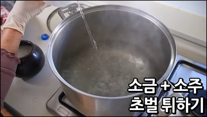 끓는 물에 소금 한 줌 넣고, 소주 적당히 넣어줍니다. 소주는 필수입니다. 그리고 갈빗살과 갈비뼈를 넣어서 3~4분 삶아줍니다. 팔팔 끓을 때 넣어서 3~4분 정도 초벌 삶아주면 되고, 만약 고기에서 잡내가 심하면 조금 더 삶아주면 됩니다.
