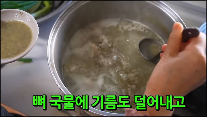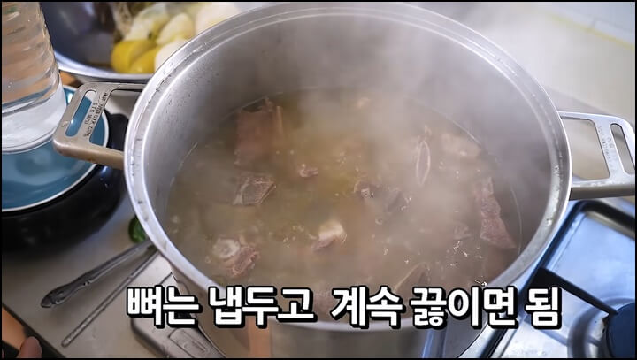 함께 넣은 뼈는 그대로 두고 계속 끓여주면 됩니다. 계속 맛있는 물이 나오니 그대로 두고 끓이면 됩니다.