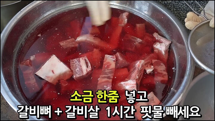 소금 한 줌 넣은 물에 갈비뼈와 갈빗살을 넣고 1시간 정도 담가서 핏물을 빼 줍니다. 1시간 정도 담가두면 핏물이 진하게 빠져나옵니다. 소금을 넣으면 삼투압으로 더 빨리 잘 빠집니다.