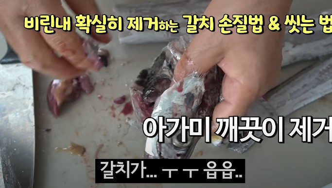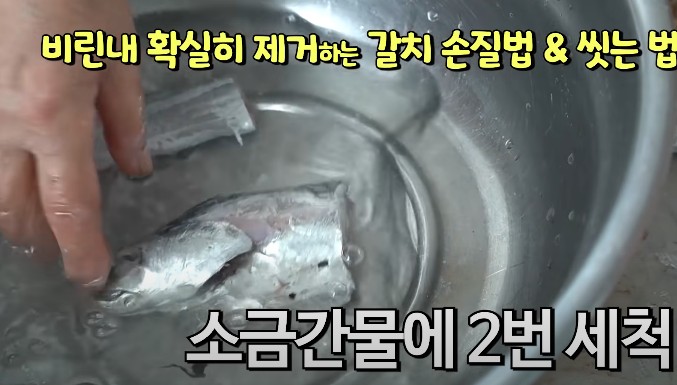 갈치의 내장과 아가미를 깨끗이 제거하고 소금물에 두번 정도 씻어줍니다. 씻으면서 내장 찌꺼기와 쓴 맛이 나는 내장의 검은 막도 깨끗이 제거하여 줍니다.