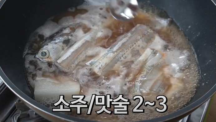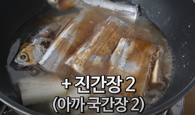 밑간해 두었던 갈치만 먼저 한번 끓여줍니다. 그러면 간장물도 배고 살도 더 단단해지게 됩니다. 갈치를 바로 물에 넣고 끓이면 갈치 살이 싱거운데, 이렇게 밑간을 해서 한번 끓이면 갈치 살에도 적당히 간이 배어서 더 맛있게 만들어집니다.