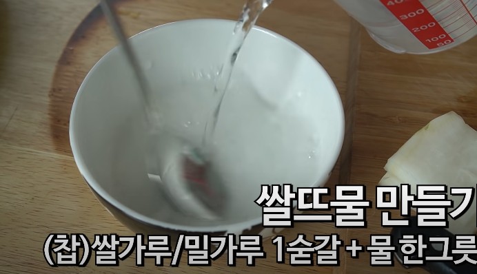 쌀뜨물을 준비했다면 그대로 사용하면 되고, 만약 쌀뜨물을 미처 준비하지 못했다면 쌀뜨물을 만들면 됩니다. 쌀가루나 밀가루 1숟갈에 물 한그릇 넣어 풀어주면 됩니다.