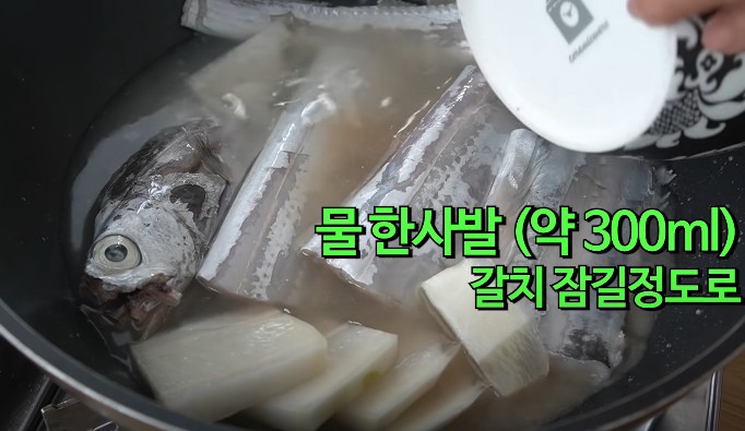 그리고 쌀뜨물 300ml 정도를 부어줍니다. 물 양은 갈치가 잠길 정도면 충분하고, 맹물, 쌀뜨물, 육수 어느 것이나 괜찮습니다.