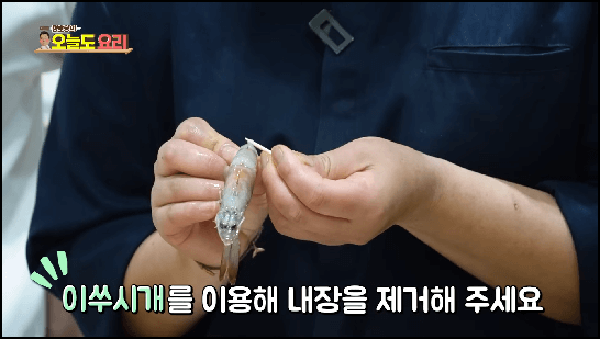 새우는 다리를 잘라주고, 물총 부분도 잘라줍니다. 꼬리 쪽 한 마디를 남겨두고 껍질을 벗겨 준 후 이쑤시개를 이용해 내장을 제거해 줍니다.