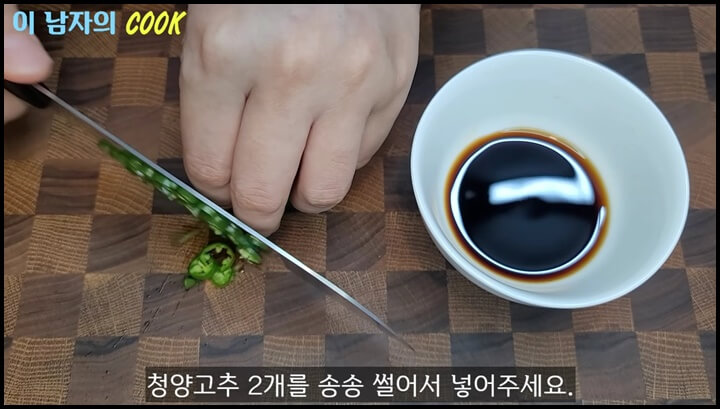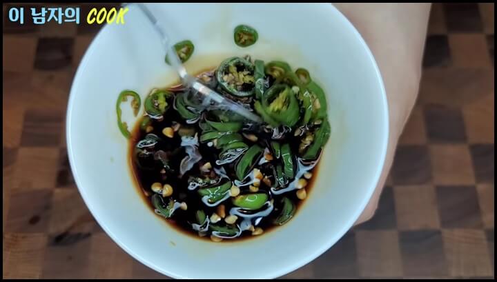 3) 청양고추 2개를 송송 썰어서 넣어줍니다. 간장에 섞인 청양고추를 감자전에 올려 먹으면 정말 맛있습니다. 감자전 맛을 더 업그레이드 시켜 줍니다!