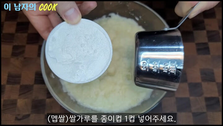 3) 여기에 쌀가루 1컵을 넣어줍니다. 찹쌀가루를 넣으면 감자떡이 되기 때문에 꼭 맵쌀가루를 넣어야 합니다. 보통 전분가루나 부침가루를 넣기도 하지만 겉바속촉한 식감과 감자 특유의 고소한 식감을 살리기 위해서는 쌀가루를 넣어주는 것이 좋습니다.