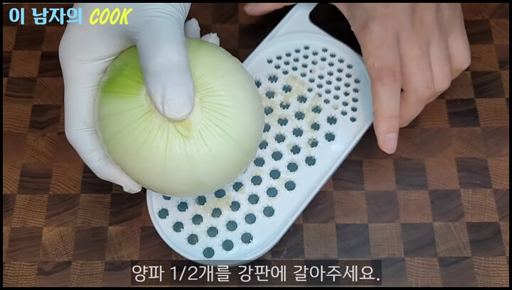 1) 양파 1/2개를 강판에 갈아줍니다. 양파를 갈아서 감자에 넣어주면 갈변을 막아줍니다. 그리고 양파 특유의 감칠맛과 달달함이 있어 감자전을 더욱 맛있게 만들어 줍니다.