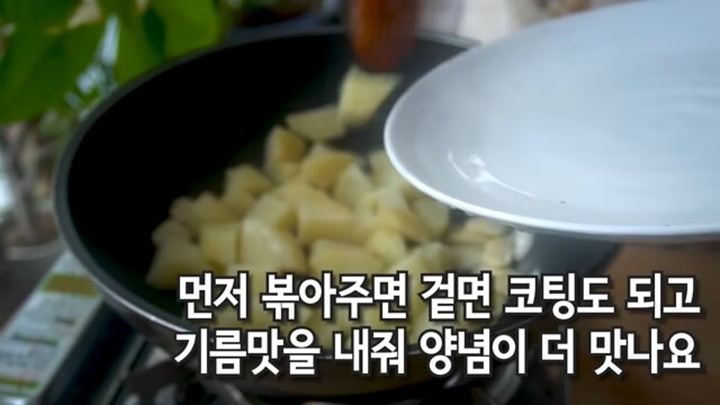 마늘을 살짝 볶다가 전자레인지에 살짝 찐 감자를 모두 넣어줍니다. 식용유에 먼저 볶아주면 겉면 코팅도 되고 기름 맛이 나면서 양념이 더욱 맛있어져요. 감자도 더 쫀득쫀득하고요!