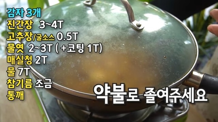 골고루 잘 섞어준 후 뚜껑을 닫고 약불로 줄여서 감자를 조려줍니다. 중간에 뚜껑을 열어서 살짝 저어주는데 너무 저으면 감자가 부서지니 살짝만 저어주세요.