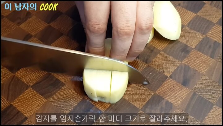 3) 감자를 엄지 손가락 한마디 정도의 크기로 잘라줍니다. 감자를 자를 때는 되도록이면 균등한 크기로 잘라야 합니다. 그래야 고르게 잘 익고, 한쪽이 너무 익어서 부스러지는 것을 방지할 수 있습니다.