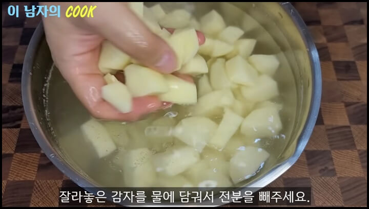 1) 자른 감자는 물에 담가서 전분기를 빼 줍니다. 이렇게 전분을 빼주면 감자끼리 달라붙는 것을 막을 수 있습니다.