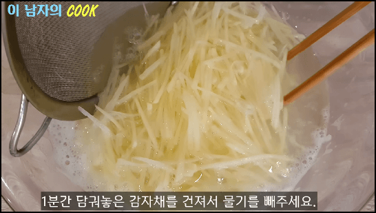 3) 채 썬 감자는 물에 1분 정도 담가서 전분기를 씻어줍니다. 전분기를 빼 주면 식감은 더 바삭해지고, 감자의 떫은 맛도 제겋됩니다.