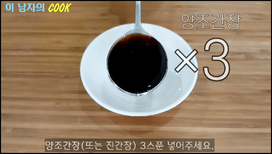 1) 양조간장 3스푼, 식초 1/2스푼, 설탕 1/2작은스푼을 넣어줍니다.