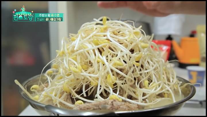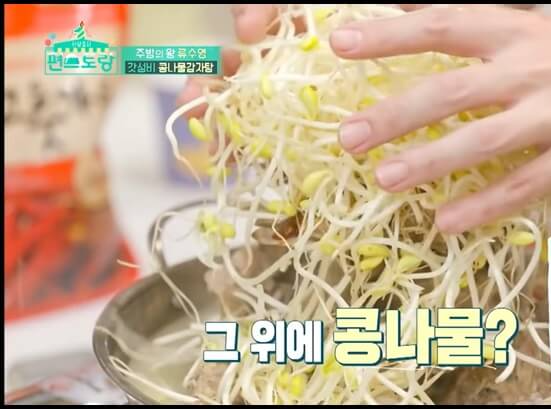 4) 그리고 콩나물을 수북히 쌓아 올려줍니다. 보통 감자탕에는 시래기를 넣어주는데 시래기 철이 아닐 때에는 콩나물을 활용해도 제법 맛이 좋습니다. 콩나물이 시원한 맛을 더해줍니다.