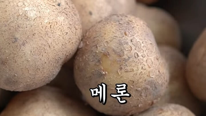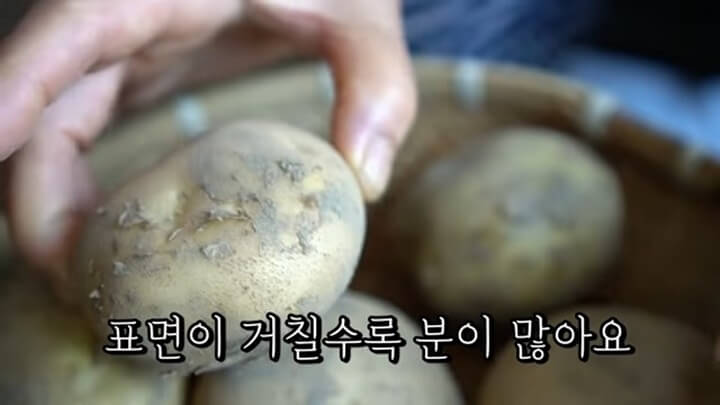 감자 중에서 껍질이 이렇게 갈라진 듯한 감자가 분이 많은 감자예요. 겉껍질이 파충류 껍질, 소보루, 멜론 같이 갈라진 듯한 모양이고요, 손 튼 것 같이 까슬까슬하고 매끄럽지 않고 거친 것이 분감자인데, 표면이 거칠수록 분이 많다고 해요.