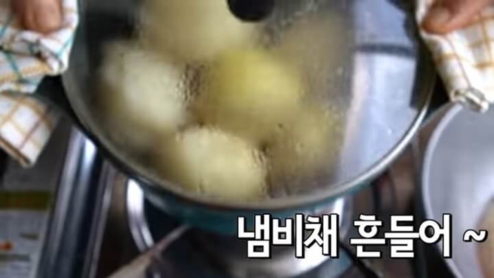 다 익은 감자에 신선당 물을 끼얹어 줍니다. 그런 다음 뚜껑을 덮어 냄비채 흔들어 감자를 한 바퀴 굴려줍니다.