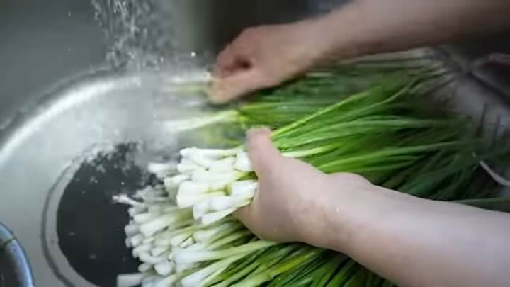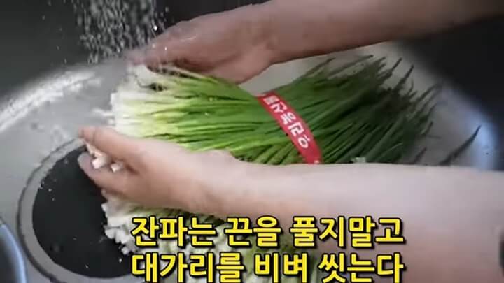 잔파는 끈을 풀지 말고 그대로 놓고 흐르는 물에 뿌리 쪽을 비벼가며 씻어줍니다. 대가리를 비벼가며 뿌리 쪽에 묻은 흙을 씻어낸 후 이제 끈을 풀고 살살 흔들어가며 씻어줍니다.