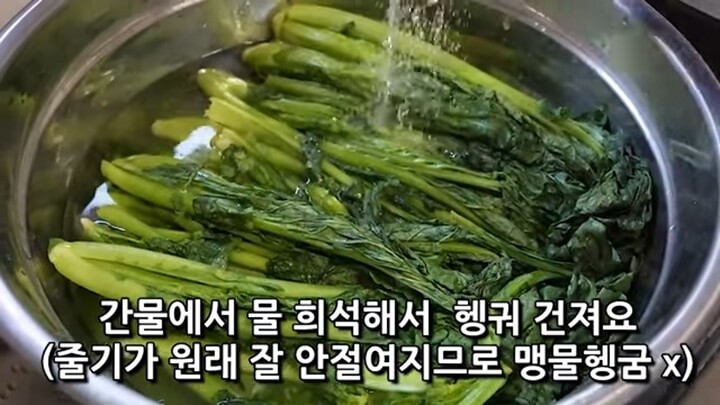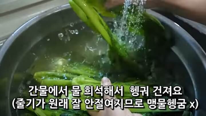 절인 갓을 헹궈주는데, 맹물에 헹구는 것이 아니라 소금 간물에 물을 희석해 넣어서 헹궈줍니다. 갓 줄기가 잘 절여지지 않기 때문에 맹물로 헹구는 것보다는 이렇게 하는 것을 권합니다.
