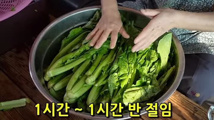 그런 다음 갓을 넣고 절여주는데, 줄기 쪽은 원래 숨이 잘 죽지 않으니 이파리 부분이라도 절여지면 김치를 담을 수 있습니다.