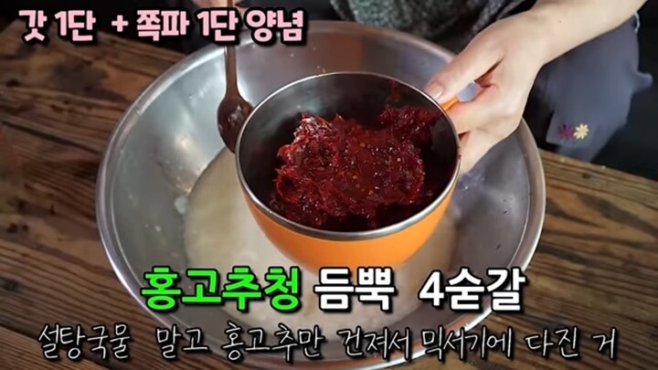 홍 고추청 듬뿍 4 숟갈을 넣어주는데, 설탕 국물 말고 홍고추만 건져서 믹서기에 다진 것을 듬뿍 4 숟갈 넣어줍니다. 만약 홍 고추청이 없다면 홍고추 5~7개 정도 다진 것+매실액 4 숟갈로 대체하면 됩니다.