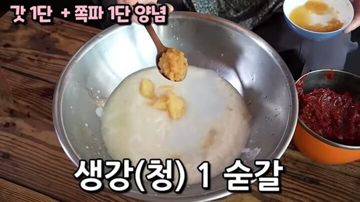 멸치액젓 160ml를 넣고, 간 마늘 3 숟갈, 생강(청) 1 숟갈도 넣어줍니다.