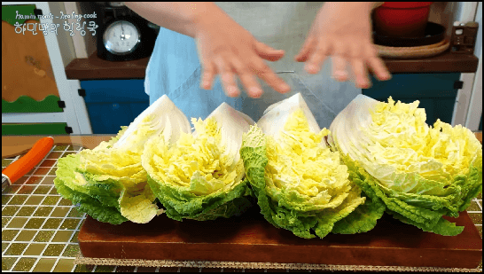 날씨에 따라 절여지는 시간은 조금씩 조절하면 되는데, 배추를 절였을 때 줄기 부분이 톡 부러질 정도로만 절여야 아삭아삭 식감이 살고 더 맛있습니다. 푹 절이지 않아도 되니 아삭한 맛을 살릴 수 있도록 절여주면 됩니다.