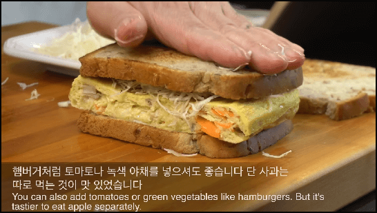 양배추 섞은 계란물만 구워도 되지만 겉면의 색을 노랗게 가지런히 정돈하기 위해 계란 1개를 따로 풀어서 구워준 것입니다. 가정에서 계란말이 예쁘게 만들 때 이렇게 활용해보시면 되고, 만약 편하게 드시려면 그냥 양배추계란물만 구워서 드셔도 좋을 듯 합니다.