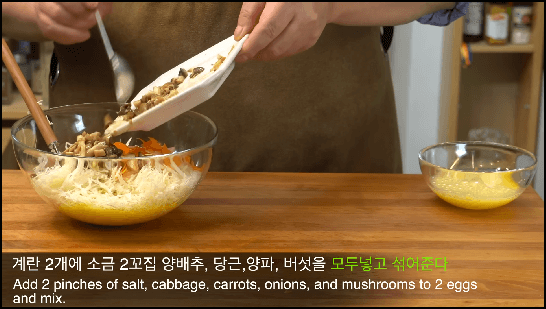 이제 계란을 준비합니다. 계란은 총 3개가 필요한데, 계란2개와 계란 1개를 따로 풀어줍니다. 계란 2개 푼 그릇에 소금1꼬집을 넣고 채 썬 양배추를 모두 넣은 다음, 당근과 양파를 대충 잘게 다져서 넣어줍니다. 그리고 버섯 양념한 것도 같이 넣고 잘 섞어줍니다. 계란이 부족한 듯 보이지만 절대 부족하지 않습니다.