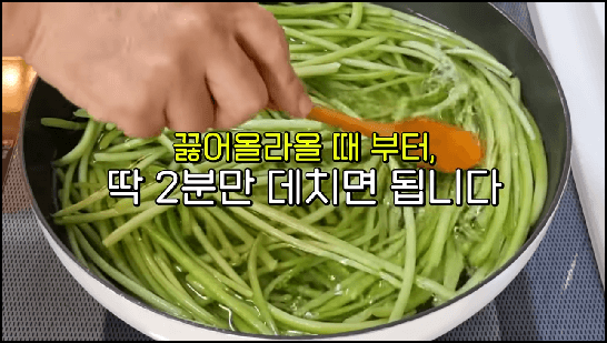 2분 간 데친 고구마줄기는 건져내어 찬물에 식혀줍니다. 그래야 아삭한 식감이 더욱 좋아집니다.