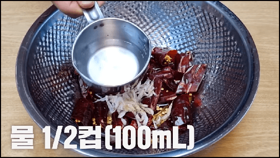 고구마줄기 김치 담그는법에서 사용할 양념에는 건고추를 넣습니다. 건고추가 들어가야 김치의 맛이 좋아집니다. 건고추 10개를 적당한 크기로 잘라주고, 여기에 새우젓 수북하게 1스푼, 멸치액젓 5스푼, 물 100ml, 식은밥 2스푼을 넣어서 불려줍니다. 중간에 한번씩 뒤집어 줍니다.