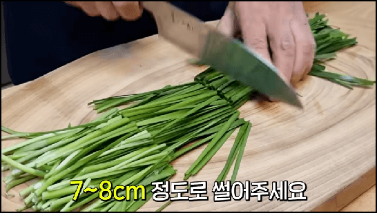 함께 넣을 부추를 7~8cm 길이로 자르고, 양파는 1/4쪽은 따로 떼 놓고 나머지만 채 썰어줍니다.