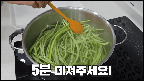 고구마줄기 데치는 시간은 5분입니다. 5분정도 데치면 딱 좋고, 더 오래 데치면 고구마순 색이 노랗게 변해버리니 5분 정도만 데쳐줍니다.