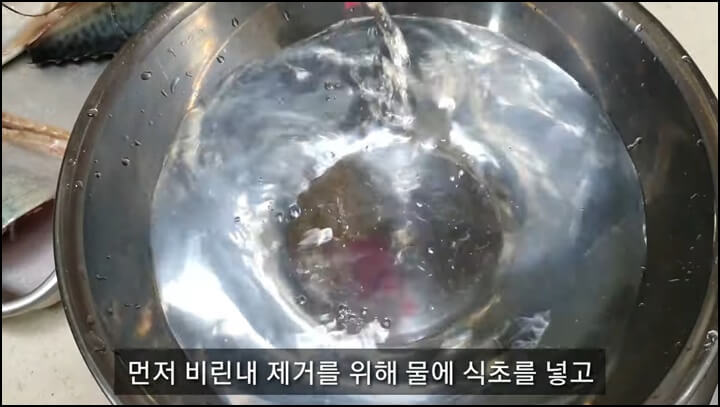 고등어를 깨끗하게 씻은 후 물에 식초를 타서 고등어를 담가둡니다. 비린내 제거를 위해 식초물에 10분 정도 담가 두면 됩니다.