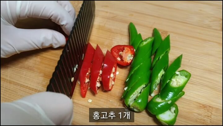 무 1토막을 적당한 두께와 크기로 잘라줍니다. 양파 반개도 굵게 채 썰어주고, 대파 1대는 적당한 길이로 자른 후 반으로 갈라줍니다. 청양고추 2개와 홍고추 1개는 어슷 썰어 줍니다.