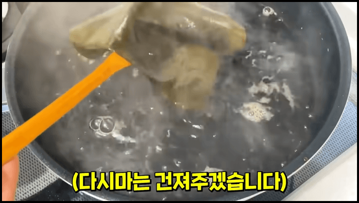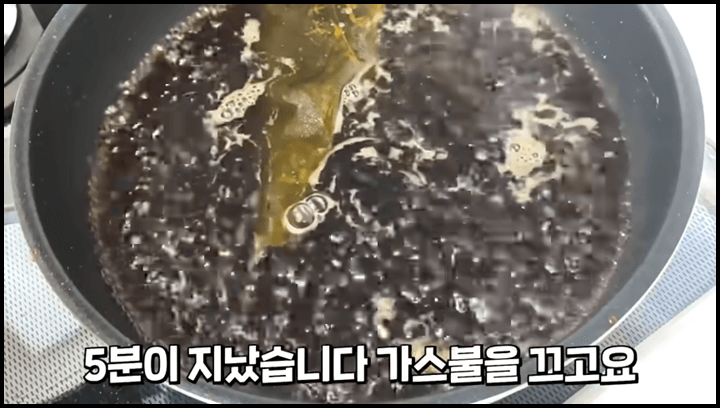 7) 5분 끓인 후 불을 끄고 다시마를 건져냅니다.
