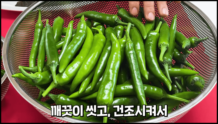 1) 고추는 식초물에 담가 15분 정도 담가서 농약을 제거해 주고 깨끗이 씻어줍니다.