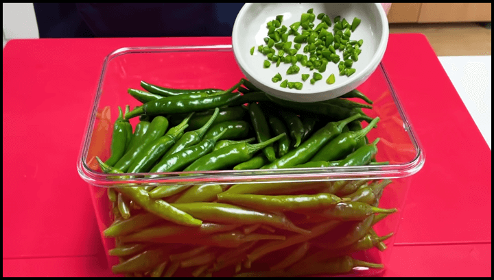 5) 끝을 자른 고추를 밀폐용기에 담아주고, 중간에 청양고추도 끝을 자른 후 담아줍니다.