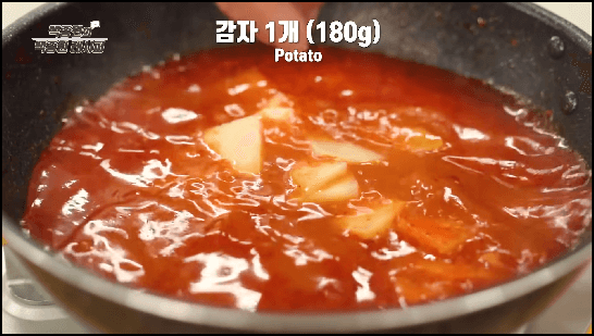 양념장이 다 볶아졌다면 물 500ml를 넣고, 양념장을 골고루 잘 풀어줍니다. 그런 다음 감자를 먼저 넣고 끓이다가 대패삼겹살을 모두 넣어줍니다.